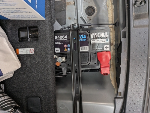 本日9/11(金)に早速ディーラーに持ち込み装着してもらいました。本国での適合検索ではばっちり適合サイズ指定のバッテリーですが、元々の純正のものは横幅275mmで、日本でクーガにお乗りの方で他に315mm幅のバッテリーに替えた事例を国内で見る限りでは見つけられなかったので少々不安もありましたが、全く問題なく装着できました。